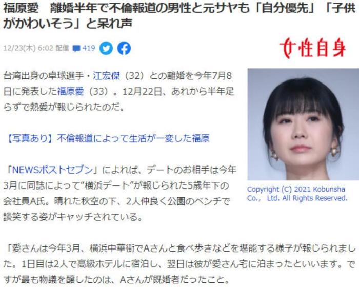 《周刊文春》报道,福原爱的现男友是28岁的商业精英,这位男子之前是已婚状态,不过在去年11月已经离婚,而两人在2月被拍到一起出游横滨时,交往没超过1个月。因此该男子表示,他和福原爱并不是出轨。但该男子的前妻却并不这么表示,前妻称两人离婚与福原爱有直接关系。