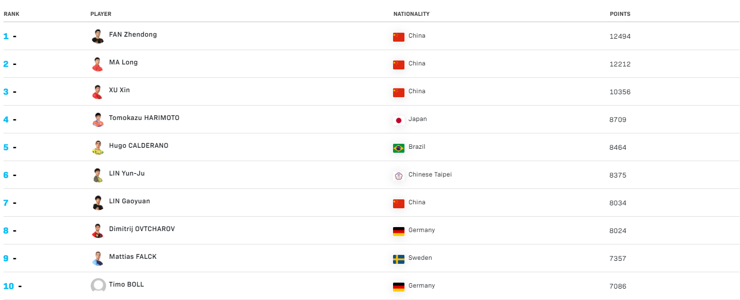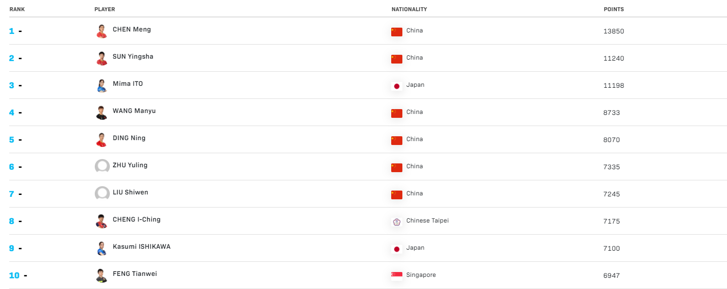 乒乓球最新世界排名(2021年11月2日)