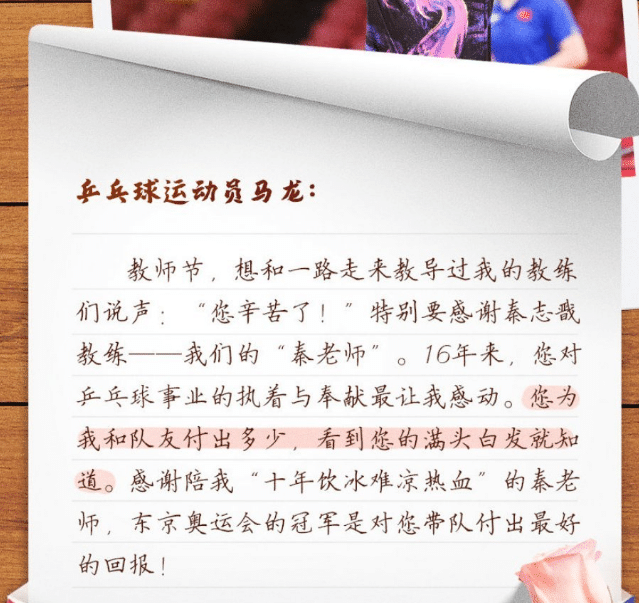 24直播网9月10日讯 ,是一年一度的教师节。这个日子,是属于所有老师的节日。对于乒乓球运动员马龙来说,他的教练们就是他的老师。在这个日子,马龙也写下亲笔信,向所有指导过他的教练,特别是秦志戬教练,送上了节日祝福。