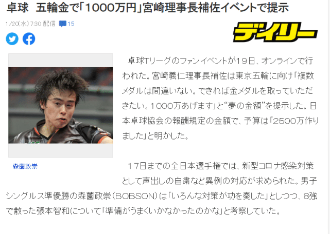 24直播网讯 北京时间1月20日,来自日本媒体的消息,为了激励日乒选手在东京奥运会上取得好成绩,日本乒协理事长宫崎义仁在参加一次活动时表示,如果日本选手在东京奥运会上夺金,将会被奖励1000万日元(约合62万元人民币)。不过这一表态也遭到日本网友嘲讽,纷纷表示这是“空头支票”。因为奥运会办不办还是大问题,更何况即便奥运会举办了,日乒想击败中国队也很难。