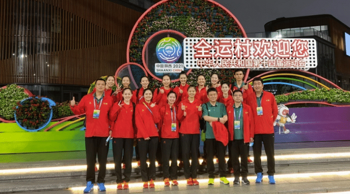 还有张常宁与主帅蔡斌、龚翔宇等人在亚运村前面合影,这也是标志性的地方,来到全运会的,几乎没有人不在这里进行合影。