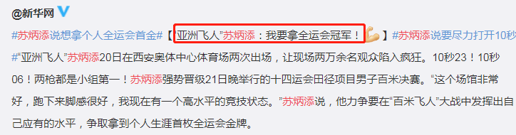 而在接受采访时,苏炳添定下了两大目标,拿到全运会冠军+冲进10秒以内。苏炳添非常直接,就是想要拿到金牌,弥补他多次参加全运会却无缘金牌的遗憾。对于苏神来说,这两个目标都可能实现,如果跑进10秒以内,他大概率就是冠军了,能在奥运会跑出9秒83,相信苏神在全运会上,也能有比较好的发挥。