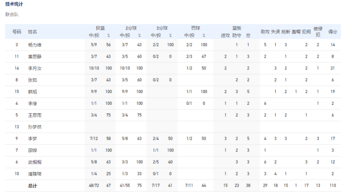 奥运联合队:李月汝21分,韩旭19分5篮板,李梦17分5篮板4助攻,武桐桐12分,杨力维14分;