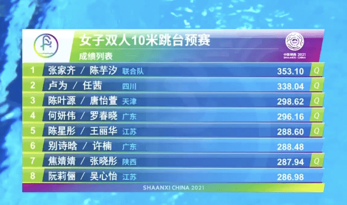 24直播网9月09日讯 ,全运会跳水女子双人10米跳台预赛率先打响。奥运冠军组合张家齐/陈芋汐展示了超强的统治力,最终毫无悬念拿到第一名,进入晚间的决赛。对于两人来说,如果决赛她们正常发挥,这枚金牌将是囊中之物。