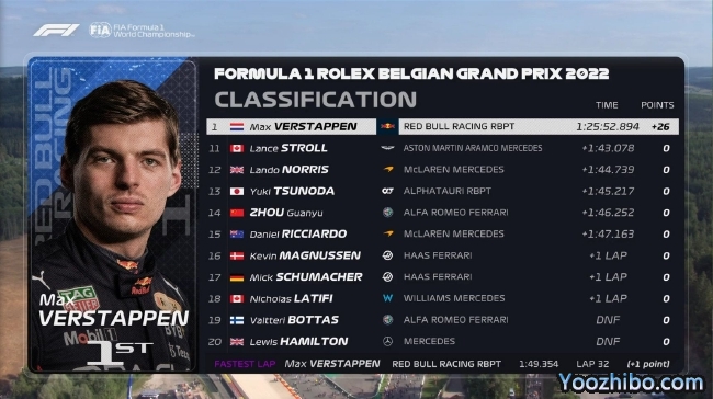 24直播网讯 2022年F1比利时大奖赛正式比赛在斯帕赛道结束,红牛车队维斯塔潘凭借第一个Stint的强势表现迅速提升排名,一停后超越塞恩斯轻松取得领跑。随后他没有再遭遇挑战,轻松拿到赛季第九冠!他的队友佩雷兹亚军,红牛再次一二带回,法拉利车队塞恩斯季军。