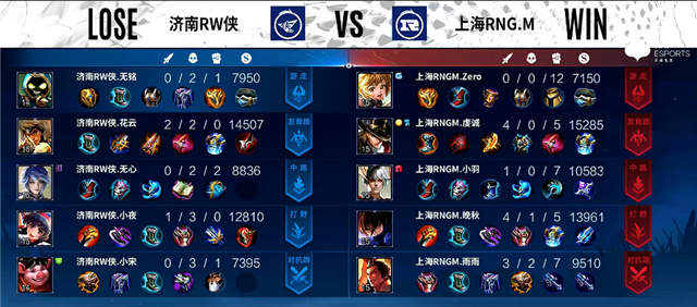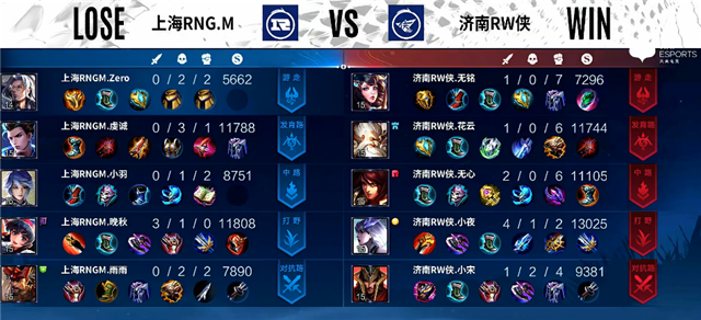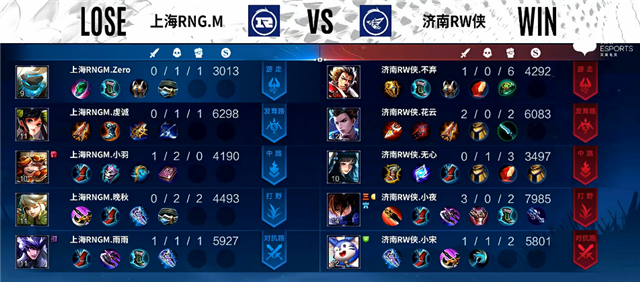 开局中路团战,济南RW侠打出1换2,嬴政拿下一血。1分20秒下路团战,济南RW侠打出0换2。3分钟李元芳拿下暴君。3分30秒镜拿下主宰。6分钟蒙犽推掉下路一塔。7分钟李元芳推掉下路一塔。7分12秒上路团战,济南RW侠打出0换2。8分05秒露娜拿下主宰。9分13秒河道团战,吕布被击杀。9分45秒镜拿下暴君。10分钟嬴政被击杀,周瑜推掉中路一塔。10分24秒露娜拿下暴君。11分40秒中路团战,盾山被击杀。12分50秒野区团战,吕布被击杀。14分钟镜拿下主宰。14分27秒镜拿下暴君。15分14秒嬴政推掉上路高地塔,团战济南RW侠打出1换2。16分钟李元芳推掉中路一塔。16分50秒中路团战,济南RW侠打出1换4。17分47秒济南RW侠推掉水晶拿下本场比赛胜利。
