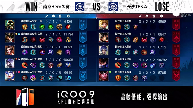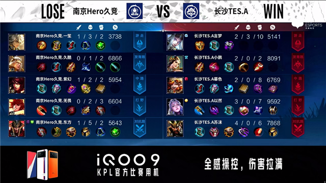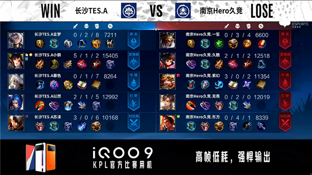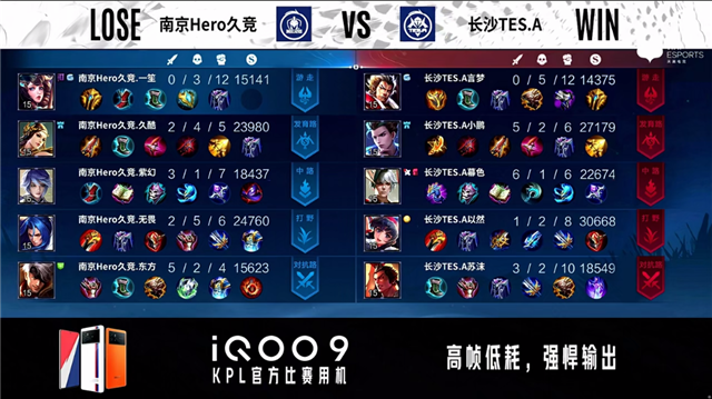 3分01秒,南京Hero久竞控下暴君。4分22秒,长沙TES.A橘右京中路击杀吕布拿下一血。5分18秒,长沙TES.A击杀牛魔。6分16秒,长沙TES.A破到南京Hero久竞上一塔。7分38秒,南京Hero久竞控下暴君。8分32秒,长沙TES.A破掉南京Hero久竞上二塔。8分46秒,南京Hero久竞沈梦溪击杀姜子牙,随后控下先知主宰。11分04秒,长沙TES.A破掉南京Hero久竞中一塔。11分17秒,长沙TES.A控下暗影主宰。12分30秒,长沙TES.A击杀吕布。12分59秒,南京Hero久竞控下暗影暴君。14分42秒,长沙TES.A孙尚香击杀暃。15分32秒,长沙TES.A破掉南京Hero久竞上高地。16分08秒,长沙TES.A孙尚香下路击杀吕布,随后破掉南京Hero久竞下、中高地。16分40秒,南京Hero久竞高地防守战打出1换2。17分23秒,南京Hero久竞控下暗影暴君,双方团,长沙TES.A打出0换2。18分04秒,长沙TES.A击杀暃。18分18秒,长沙TES.A摧毁南京Hero久竞水晶率先拿到赛点。