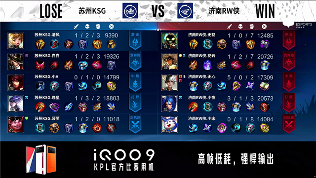 3分31秒,济南RW侠控下暴君,随后苏州KSG控下先知主宰。4分37秒,济南RW侠破掉苏州KSG下一塔。5分45秒,济南RW侠破掉苏州KSG上一塔。7分48秒,苏州KSG控下暴君,随后济南RW侠控下先知主宰。10分37秒,济南RW侠李元芳抢到暗影暴君,随后团战济南RW侠打出1换3。11分03秒,济南RW侠破掉苏州KSG中路两座外塔。11分23秒,济南RW侠破掉苏州KSG下高地。12分54秒,济南RW侠击杀盘古。13分25秒,中路团战双方1换1,随后破掉苏州KSG中高地。15分37秒,济南RW侠控下暗影主宰。15分40秒,双方团战1换1。18分47秒,济南RW侠控下暗影主宰。19分12秒,济南RW侠控下暗影暴君。23分10秒,济南RW侠控下风暴龙王,随后团战济南RW侠打出1换4,李元芳拿下三杀。23分53秒,济南RW侠摧毁苏州KSG水晶赢下比赛。