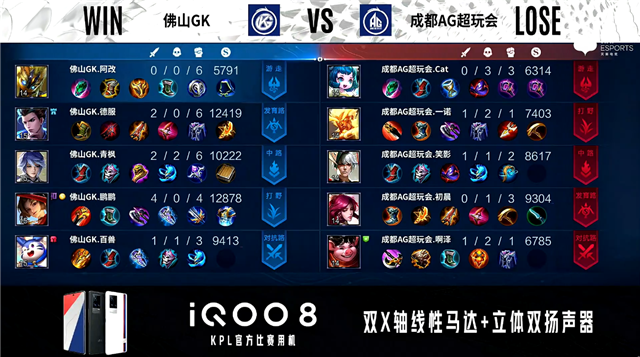 开局成都AG边路换线。2分14秒佛山GK拿下暴君。3分09秒野区团战成都AG击杀橘右京拿到一血。5分25秒双方野区1换1。6分13秒成都AG野区击杀橘右京。6分23秒成都AG摧毁敌方对抗路二塔并拿下暴君。8分10秒成都AG摧毁敌方中路外塔。8分23秒成都AG拿下主宰。9分22秒双方边路1换1。10分13秒成都AG拿下暗影暴君。12分56秒成都AG摧毁敌方中路二塔。13分42秒成都AG高地团战打出0换3摧毁敌方水晶拿下比赛。