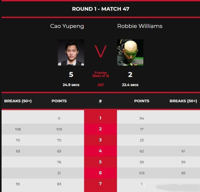 第四局,曹宇鹏单杆打出63分以63:62单局逆转绝杀单杆轰出61分的威廉姆斯取得3-1的领先。第五局,曹宇鹏76:59单局逆转单杆打出59分的威廉姆斯成功取得4-1领先的同时更是直接拿到赛点。第六局,威廉姆斯单杆打出65分103:22拿下此局2-4落后曹宇鹏。第七局,曹宇鹏单杆55分从以83:1拿下此局5-2击败了对手。