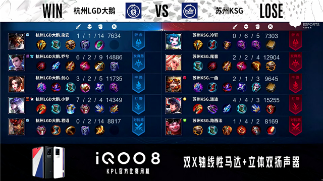 1分55秒,苏州KSG不知火舞上路击杀夏侯惇拿下一血。2分37秒,杭州LGD大鹅控下暴君。3分27秒,杭州LGD大鹅破掉苏州KSG下一塔。3分42秒,苏州KSG团战击杀张良。4分26秒,苏州KSG控下先知主宰。5分18秒,杭州LGD大鹅破掉苏州KSG上一塔。5分59秒,杭州LGD大鹅破掉苏州KSG中一塔。6分49秒,杭州LGD大鹅控下暴君。7分43秒,双方团战1换1。8分01秒,杭州LGD大鹅追击再次击杀敌方两人。9分38秒,杭州LGD大鹅破掉苏州KSG中二塔。10分10秒,中路团,杭州LGD大鹅打出0换3。10分33秒,杭州LGD大鹅破掉苏州KSG中高地,随后团战杭州LGD大鹅打出1换2。10分57秒,杭州LGD大鹅破掉苏州KSG下高地。11分45秒,杭州LGD大鹅控下暗影暴君。12分11秒,双方团,杭州LGD大鹅打出1换5团灭对手。12分36秒,杭州LGD大鹅摧毁苏州KSG水晶赢下比赛。