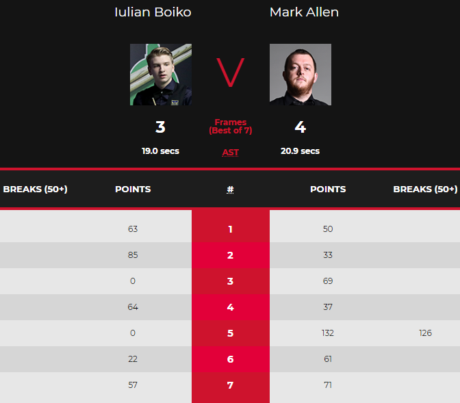 一上来博伊科就2:0领先马克-艾伦随后又是3:1扩大战果。随后的两局比赛,马克-艾伦拼尽全力,将比分改写为3:3。决胜局的较量两个人陷入缠斗,在决胜局的比赛中。马克-艾伦更是0:42大比分落后,由于年轻的博伊科经验不足出现了致命失误,让马克艾伦在0:42大比分落后的情况下完成逆转,晋级32强。