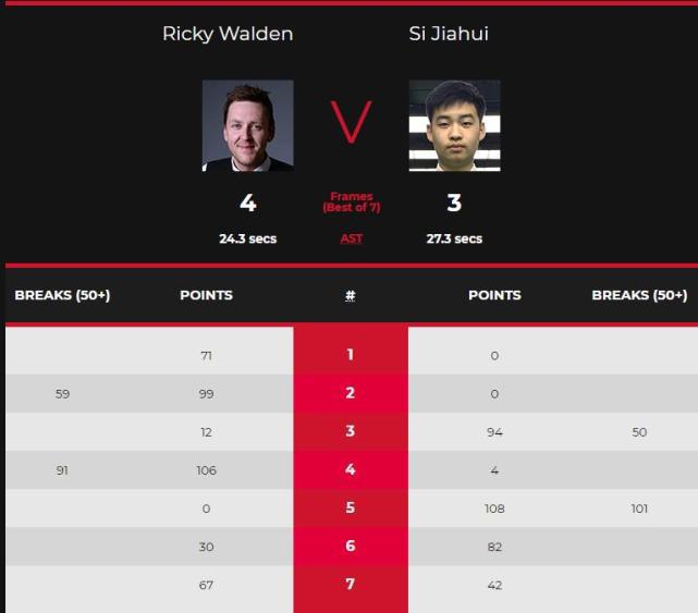 第七局,沃顿凭借多次上手机会拿到67分从而以67:42拿下此局4-3绝杀斯佳辉晋级本届赛事的第三轮,而斯佳辉则是止步64强遗憾地告别了直布罗陀公开赛。