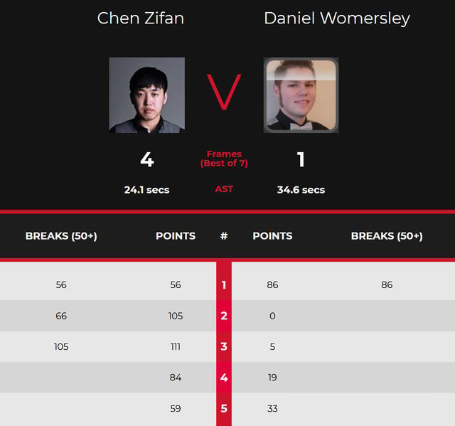 第一局,陈子凡出师不利,单杆56分后失误,海莫斯利抓住机会,单杆86分一杆制胜,86-56赢下了第一局,陈子凡0-1遭遇开门黑。