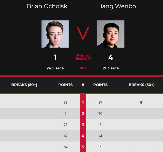 第一局上来,梁文博迅速进入状态,轰出了单杆81分、97-29拿下了开门红。第二局,奥库斯基更是仅仅拿到2分,梁文博70-2大胜,再胜一局。第三局,奥库斯基终于顶住了压力,75-6大胜,追回了一局。