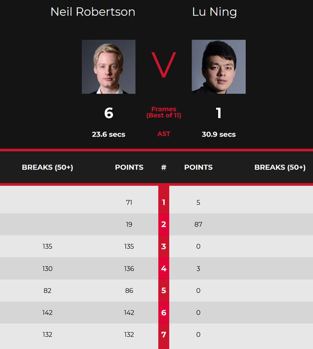 第一局,两人打得断断续续,进入到鏖战,鲁宁多次漏机会,罗伯逊多杆上手完成超分,71-5顺利拿下。第二局,鲁宁入局,49-0后白球摔袋,鲁宁再上手87-19拿下1-1平。