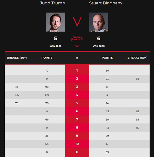 在首局比赛中,宾汉姆以56:10的比分获胜取得1-0的领先,随后又是凭借单杆93分再下一城取得2-0的领先优势。紧接着,特鲁姆普凭借单杆81分、105分和76分的强势表现连下三局从而以3-2的比分反超宾汉姆取得领先。第六局,宾汉姆上手后一度有冲击147分的机会,结果止步113分,不过还是追至3-3。