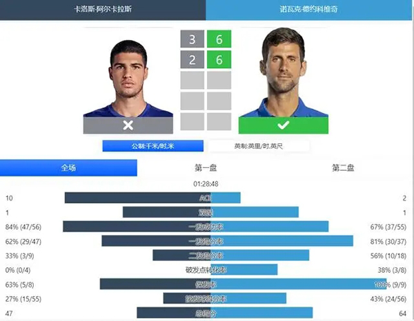 第一盘,两人上来的第1个发球局都遇到了不小的阻力,但还是成功保发,在随后两人又各自保发,一直到了第8局,德约科维奇终于是率先实现了破发,5-3领先,第9局,德约科维奇兑现了发球胜盘局,6-3顺利先下一城,大比分1-0领先阿尔卡拉斯。