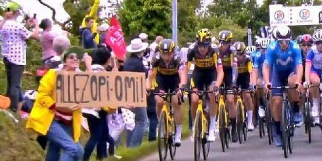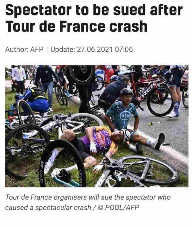 6月26日,环法自行车赛遭遇了历史上最混乱的一幕,这场混乱的事故发生在距离还有45公里的时候。此时一名德国美女观众为了抢镜在镜头上展示自己,她突然探出了身子,展示了一条写着“祖母加油”的横幅。
