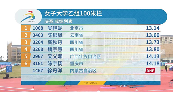 24直播网11月10日讯 学青会大学乙组女子100米栏决赛,吴艳妮以13秒14的成绩夺冠,这场比赛林雨薇和夏思凝没有参赛,只有7名选手出战,吴艳妮在第6道。决赛开始之后,吴艳妮全程领跑,最终毫无悬念夺得冠军,斩获金牌。