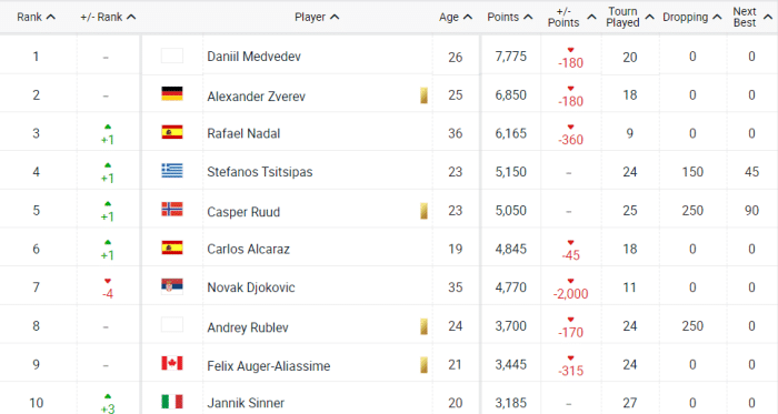 最新一期的世界排名显示,梅德韦杰夫7775分继续高居第一,小兹维列夫6850分排名第二,纳达尔6165分重返前三。西西帕斯、鲁德和阿尔卡拉斯分列3-6位。而德约科维奇在扣除去年夺冠的2000积分之后,排名下滑4位已经来到第7位。卢布列夫第8,阿利亚西姆第9,辛纳第10位。