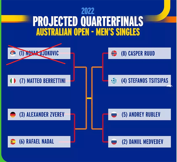 德约退赛后,他的签位将由一位资格赛幸运落败者取代,1/4区的大种子则是7号种子、去年温网亚军贝雷蒂尼、12号种子诺里、16号种子加林、19号种子布斯塔,另外在阿德莱德刚刚夺冠的孟菲尔斯也在这个1/4区。