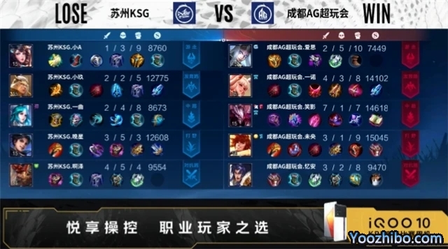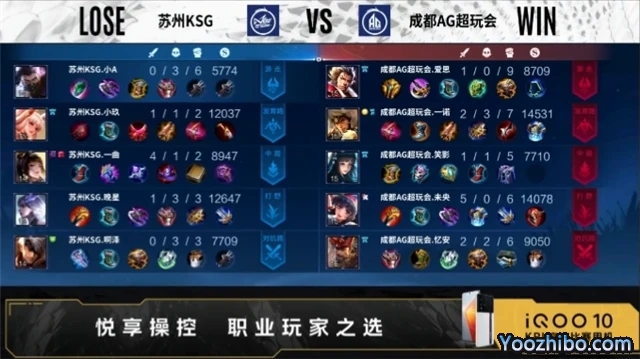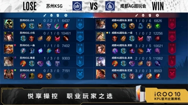 开局双方正常抢线。48秒野区成都AG超玩会击杀大乔,拿下一血。2分06秒发育路苏州KSG击杀公孙离,打出0换1。2分40秒中路成都AG超玩会击杀王昭君,打出0换1。3分42秒成都AG超玩会拿下暴君。4分43秒成都AG超玩会摧毁敌方发育路外塔,对抗路苏州KSG击杀项羽。5分25秒对抗路成都AG超玩会击杀廉颇,野区苏州KSG击杀干将莫邪,打出1换1,成都AG超玩会摧毁敌方对抗路外塔。5分54秒野区成都AG超玩会击杀王昭君,打出1换3。6分58秒成都AG超玩会拿下主宰。8分29秒成都AG超玩会拿下暴君,苏州KSG摧毁敌方对抗路外塔。9分22秒成都AG超玩会摧毁敌方中路外塔。9分50秒河道苏州KSG击杀裴擒虎,成都AG超玩会项羽二连击破,打出2换4,摧毁敌方中路二塔。11分34秒中路苏州KSG击杀东皇太一,双方打出1换1。12分56秒成都AG超玩会拿下暗影暴君。13分21秒高地成都AG超玩会击杀曜,打出1换1,摧毁敌方发育路高地。14分41秒成都AG超玩会拿下暗影主宰。15分02秒高地成都AG超玩会击杀王昭君,苏州KSG击杀公孙离,打出1换2。16分47秒成都AG超玩会拿下暗影暴君。17分17秒野区成都AG超玩会击杀廉颇,摧毁敌方中路高地、对抗路高地。18分00秒高地苏州KSG击杀东皇太一,成都AG超玩会打出2换5,团灭对手摧毁水晶拿下比赛。