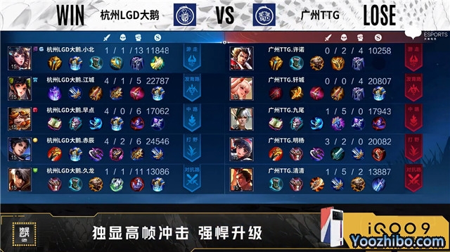 双方常规开局。4分整杭州LGD大鹅拿下暴君,广州TTG拿下主宰。4分53秒杭州LGD大鹅对抗路击杀夏洛特拿到一血。5分48秒杭州LGD大鹅摧毁敌方发育路二塔并击杀夏洛特。6分25秒广州TTG对抗路打出1换2。6分43秒杭州LGD大鹅摧毁敌方中路外塔。8分09秒杭州LGD大鹅拿下暴君。8分24秒广州TTG拿下主宰。8分56秒杭州LGD大鹅野区击杀姜子牙。9分35秒野区团战双方1换1。11分21秒广州TTG拿下暗影暴君。11分32秒杭州LGD大鹅拿下暗影主宰。12分31秒广州TTG中路击杀橘右京。15分15秒杭州LGD大鹅拿下暗影暴君。16分45秒广州TTG拿下暗影主宰。16分58秒杭州LGD大鹅摧毁敌方发育路高地塔。17分18秒杭州LGD大鹅中路击杀铠。17分52秒高地前团战杭州LGD大鹅打出3换4。18分21秒杭州LGD大鹅团灭对手摧毁水晶拿下比赛。