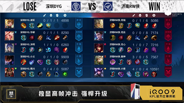 开局济南RW侠公孙离来到中路抢线。2分18秒济南RW侠拿下暴君。2分26秒济南RW侠野区击杀裴擒虎拿下一血。4分02秒深圳DYG对抗路击杀鬼谷子。4分06秒深圳DYG发育路击杀公孙离,随后摧毁敌方发育路外塔。4分50秒中路团济南RW侠打出1换2。6分15秒济南RW侠摧毁敌方发育路外塔。6分22秒深圳DYG摧毁敌方对抗路外塔。7分02秒济南RW侠摧毁敌方对抗路外塔。7分20秒中路上河道团深圳DYG打出0换2。7分50秒深圳DYG摧毁敌方中路外塔。8分29秒济南RW侠拿下主宰。8分56秒深圳DYG摧毁敌方中路二塔。9分08秒深圳DYG摧毁敌方发育路高地塔。10分43秒深圳DYG拿下暗影主宰。11分01秒深圳DYG摧毁敌方对抗路二塔。11分47秒深圳DYG摧毁敌方对抗路高地塔。13分钟对抗路团深圳DYG打出1换3。13分22秒深圳DYG摧毁水晶拿下比赛。
