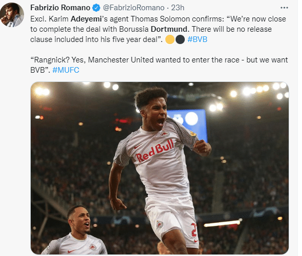 多特视阿德耶米为哈兰德的接班人,哈兰德即将加盟曼城,多特也加速引进阿德耶米。
