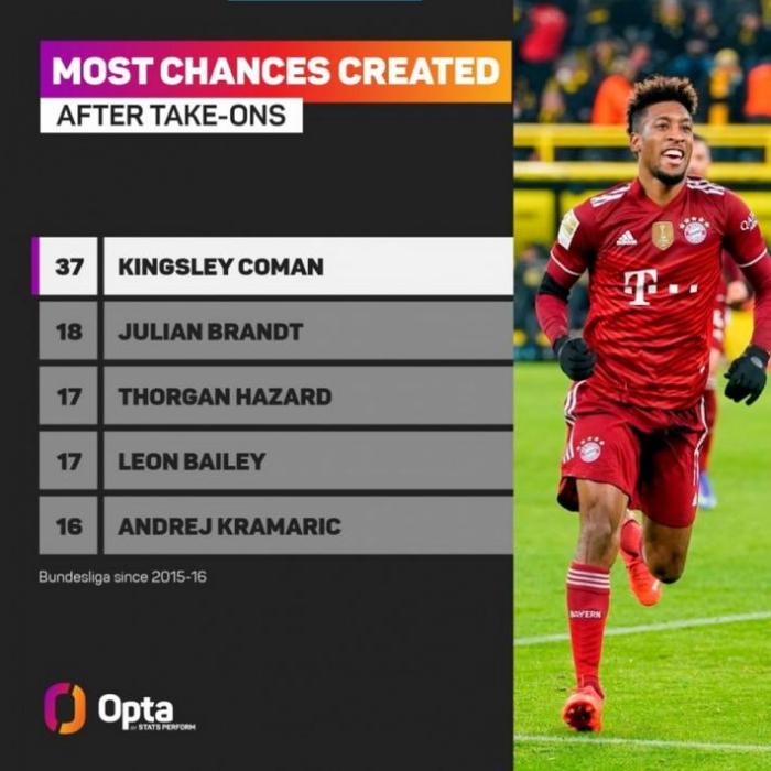 据Opta统计,自2015-2016赛季即科曼登陆德甲后,他在一对一过人后已经创造37次机会。这项数据在德甲同期遥遥领先,超过第二名两倍之多。
