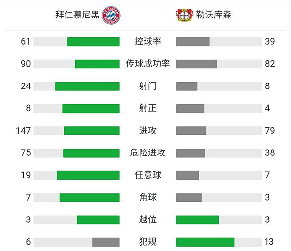 全场比赛结束,拜仁慕尼黑2-0勒沃库森。