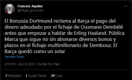 24直播网讯北京时间4月10日,根据《世界体育报》主编Francesc Aguilar透露称,多特蒙德向巴萨提出要求,如果想要讨论哈兰德的转会,首先需要付清拖欠多特蒙德的登贝莱的转会费。