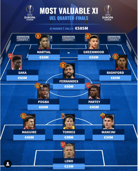 24直播网讯,德国转会市场评选出欧联杯八强最贵阵容,曼联6人入选,阿森纳3人入选。
