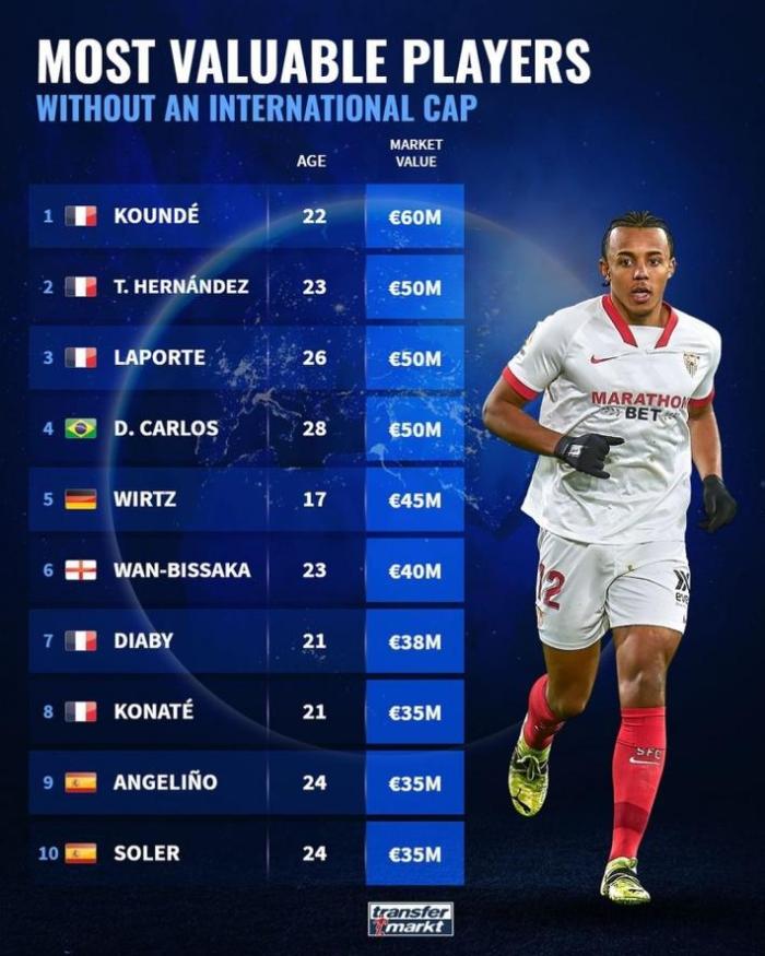 德转盘点未代表国家队出场最贵球员: 法国5人在列