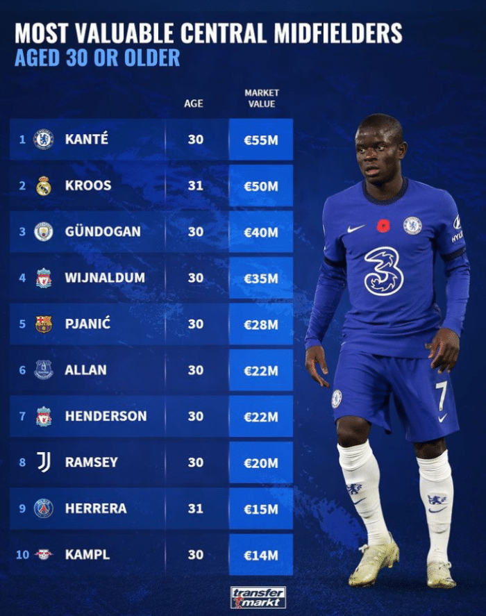 24直播网讯德国转会市场今日盘点了世界足坛最贵的30+岁中场球员名单,切尔西兽腰坎特以5500万欧元排名第一。