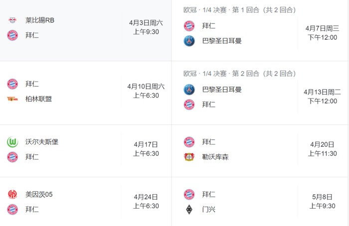 现在,拜仁俱乐部证实这位前锋右膝韧带损伤,将缺阵4周。接下来,拜仁将在联赛中客场挑战莱比锡红牛,而4月8日和14日,拜仁还要在两回合欧冠中面对巴黎圣日耳曼。