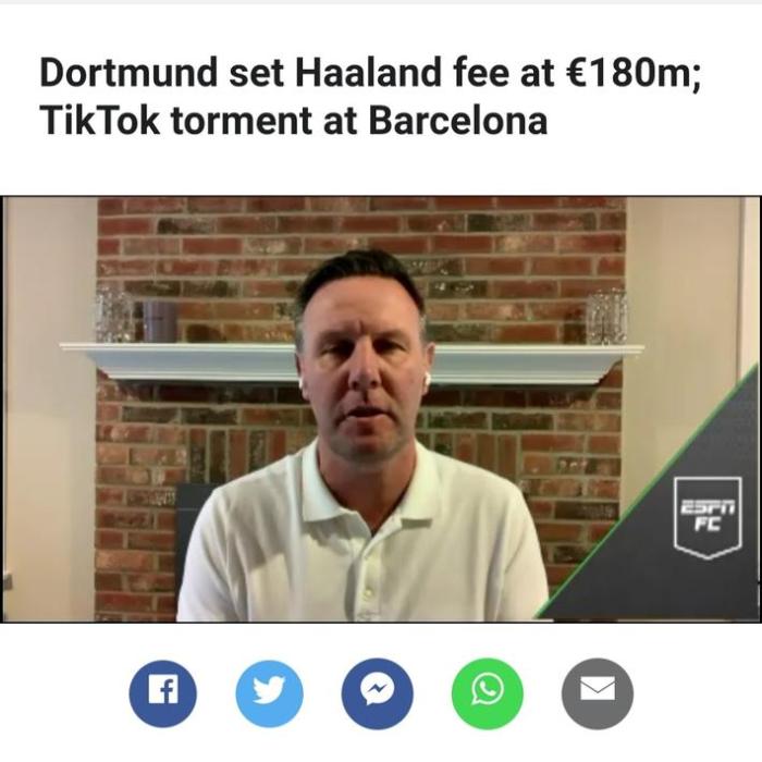 去年夏天,曼联想压低价格签下桑乔,但多特死咬1.2亿欧不放,现在对待哈兰德,他们的立场同样坚定。消息人士告诉ESPN,曼联、曼城、切尔西、皇马、巴萨和拜仁都对哈兰德有意,但转会市场深受疫情影响,多特也希望1.8亿欧的价格能帮他们再留哈兰德一年。