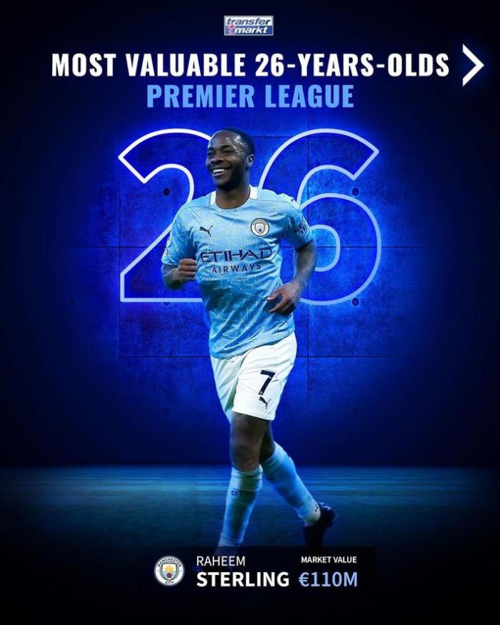 24直播网3月14日讯 德国转会市场日前盘点了欧洲五大联赛身价最高的26岁球员,斯特林以1.1亿欧元排名五大联赛第一。