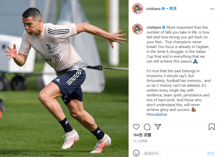 C罗写道:“比你在生活中跌倒多少次更重要的是,你能多快、多坚强地重新站起来……真正的冠军从不溃败!我们的重点已经放在了卡利亚里、意甲联赛、意大利杯决赛以及我们本赛季还能取得的荣誉上。”