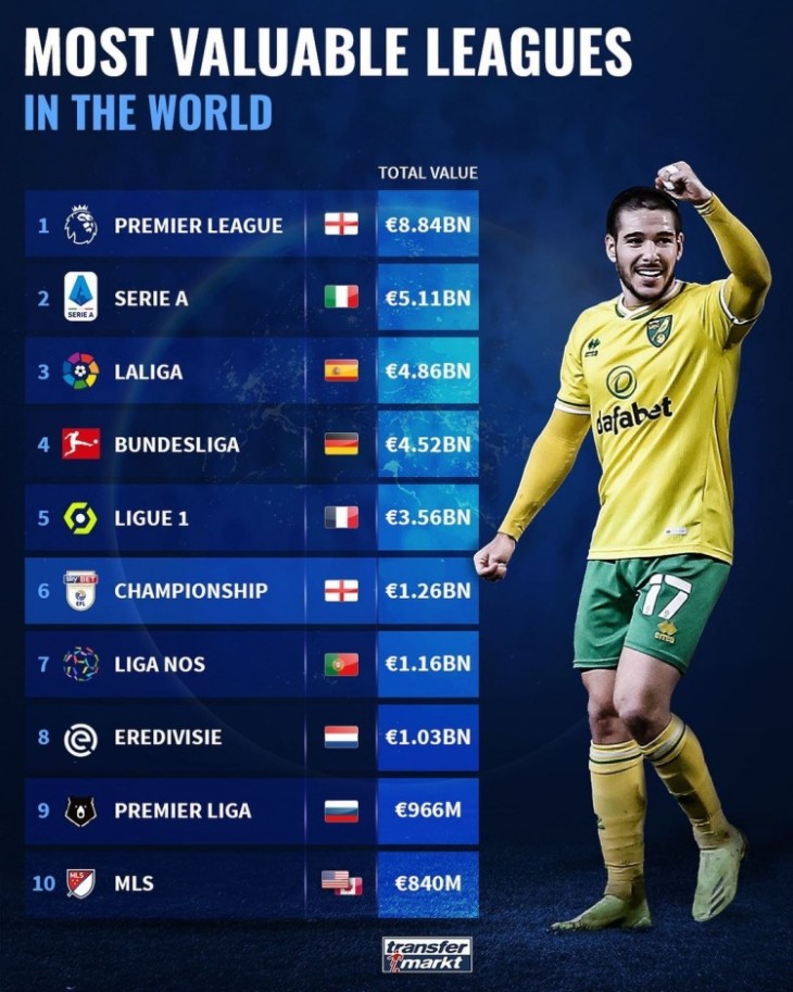 24直播网讯北京时间3月13日讯 德国足球转会市场在一份榜单中比较了当下各大主流联赛的市场价值,英超以88.4亿欧元排名榜首,前十的榜单中除了排名第十的美国大联盟外其他全为欧洲联赛。