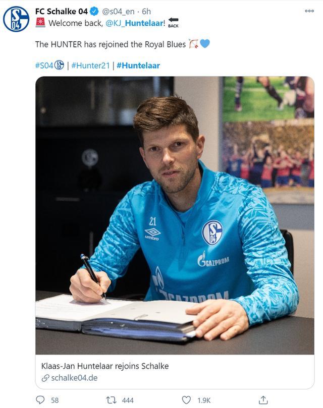 24直播网1月20日讯 今天凌晨,沙尔克04官宣签下37岁荷兰锋线老将亨特拉尔,球员将身披21号球衣,双方签约半个赛季。