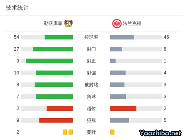 全场比赛结束,勒沃库森2-1法兰克福。