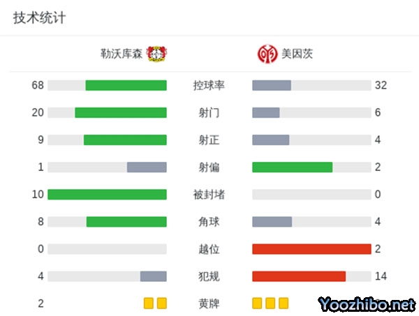 最终勒沃库森1-0美因茨先赛7连胜距榜首1分。