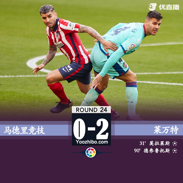 24直播网2月21日讯 北京时间2月20日23:15,西甲第24轮,马德里竞技主场迎战莱万特。上半场,莫拉莱斯开场错失单刀后劲射破门;下半场,吉梅内斯伤退,苏亚雷斯任意球中柱,科雷亚进球被吹,德弗鲁托斯最后时刻半场远射破门。全场比赛结束,马竞0-2不敌莱万特,仍然以6分优势领跑。