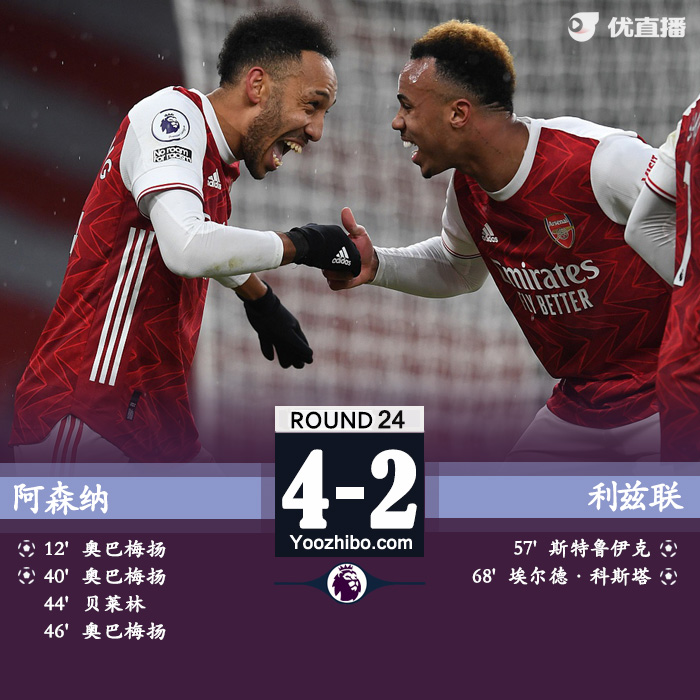 24直播网2月15日讯 北京时间2021年2月15日00:30,2020-21赛季英超联赛第24轮,阿森纳坐镇酋长球场迎战利兹联。上半场奥巴梅杨破门先拔头筹,随后萨卡造点,奥巴梅杨点射梅开二度,贝莱林再下一城;下半场奥巴梅杨完成帽子戏法,斯特鲁伊克、赫尔德-科斯塔为客队扳回两球,奥巴梅杨、萨卡先后中框。最终,阿森纳4-2击败利兹联,结束联赛三轮不胜。积分榜上,阿森纳反超利兹联升至第10位。