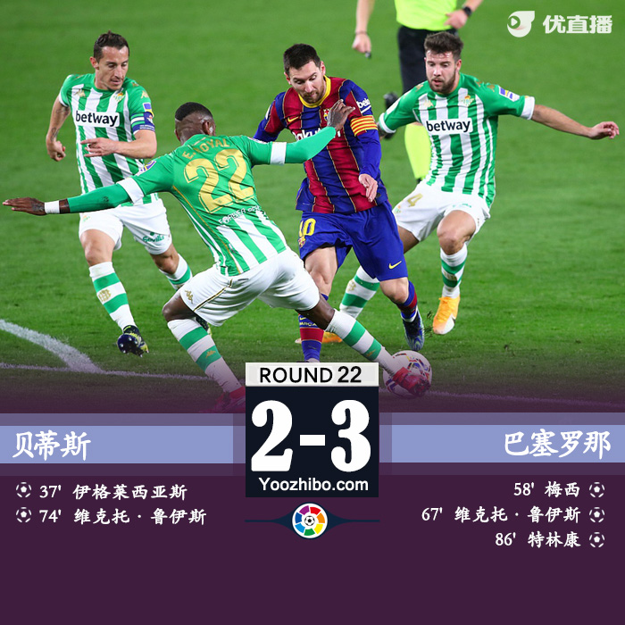24直播网2月8日讯 北京时间今天4:00,西甲第22轮巴萨客场挑战贝蒂斯。上半场伊格莱西亚斯为皇家贝蒂斯打开局面,下半场回来梅西替补登场三分钟后进球扳平,格子造乌龙反超,鲁伊斯乌龙后头球攻门扳平,特林康终场前远射制胜。全场比赛结束,巴萨做客3-2逆转贝蒂斯,收获联赛6连胜升至第二。