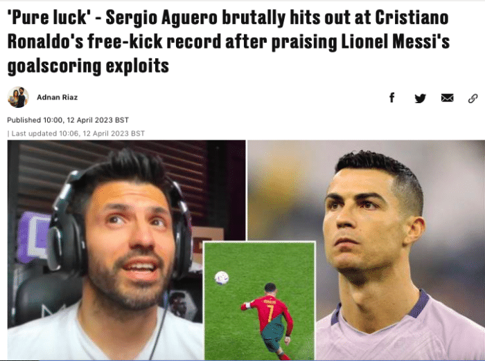 24直播网04月13日讯 ,已经退役的阿根廷球星阿奎罗在与网红伊拜的一次直播中,点评了C罗的任意球能力。阿奎罗带着轻视的语气直言,C罗的任意球纯靠运气,劳尔和本泽马都比他强,而梅西的任意球,全部都是在找角度。