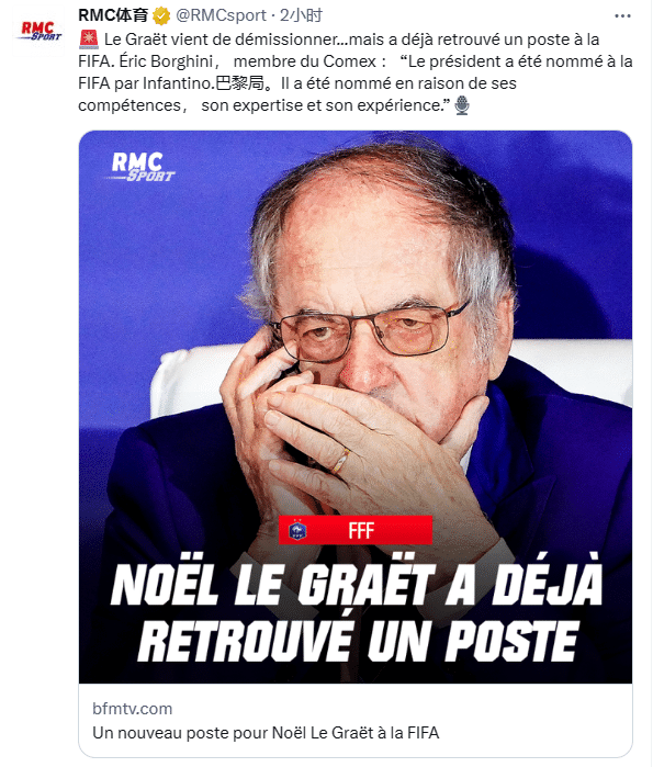 RMC写道:“勒格拉埃刚刚辞职...但已经在国际足联找到了一份工作。”