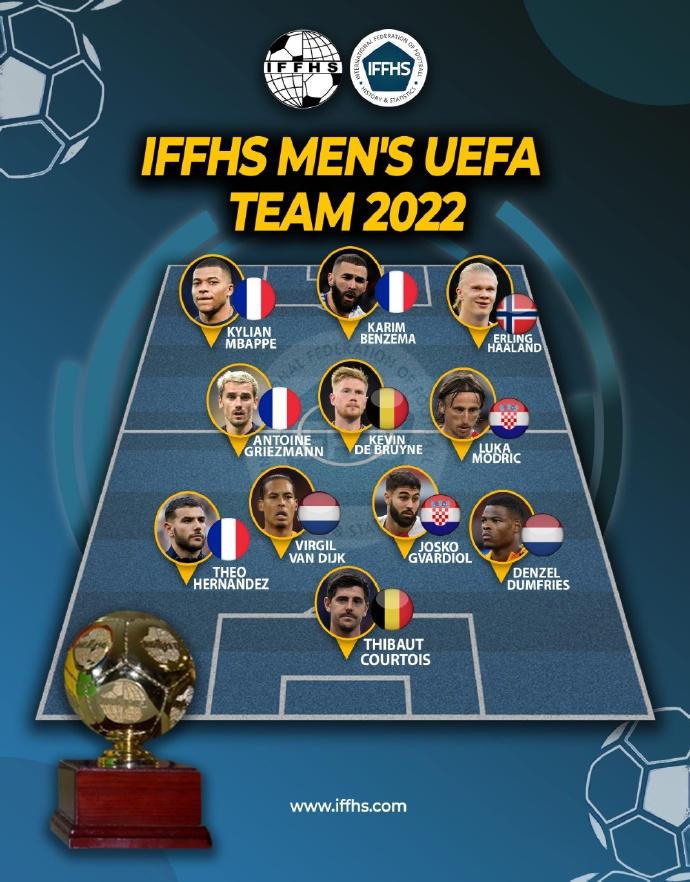 24直播网01月19日讯 ,国际足球历史和统计联合会(IFFHS)官方公布了2022年欧洲最佳阵容,姆巴佩、本泽马、哈兰德三人组成锋线!